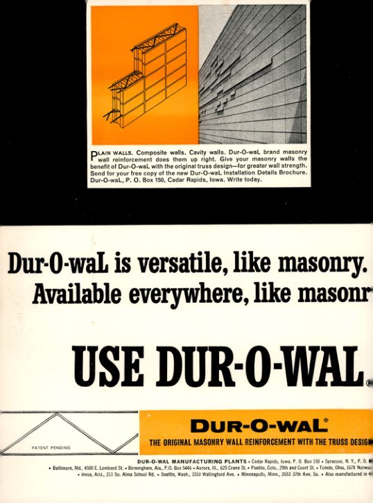 PLAIN WALLS. Composite walls. Cavity walls. Dur-O-wal brand masonry reinforcement does them up right. Give your masonry benefit of Dur-O-wal with the original truss design for greater wall strength. Send for your free copy of the new Dur-O-wal Installation Details Brochure. Dur-O-waL, P. O. Box 150, Cedar Rapids, lowa. Write today.