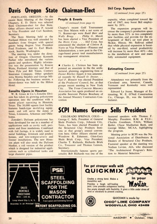 Charles L. Christen has been appointed an associate in the the architectural, planning, engineering firm of Deeter Ritchey Sippel, it was announced recently by Russell O. Deeter. Earl F. Bennett was elected President of the Producers Council, Inc. at that groups recent meeting in New York City. The Texas Concrete Masonry Association has again produced an enjoyable Souvenir Picture Brochure of the Annual Masonry Contractors Convention.