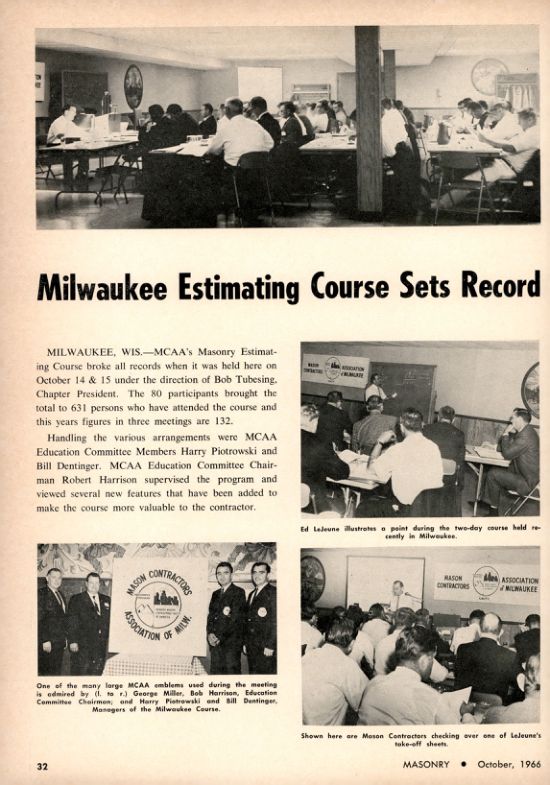 MILWAUKEE, WIS.-MCAA's Masonry Estimating Course broke all records when it was held here on October 14 & 15 under the direction of Bob Tubesing, Chapter President. The 80 participants brought the total to 631 persons who have attended the course and this years figures in three meetings are 132.
