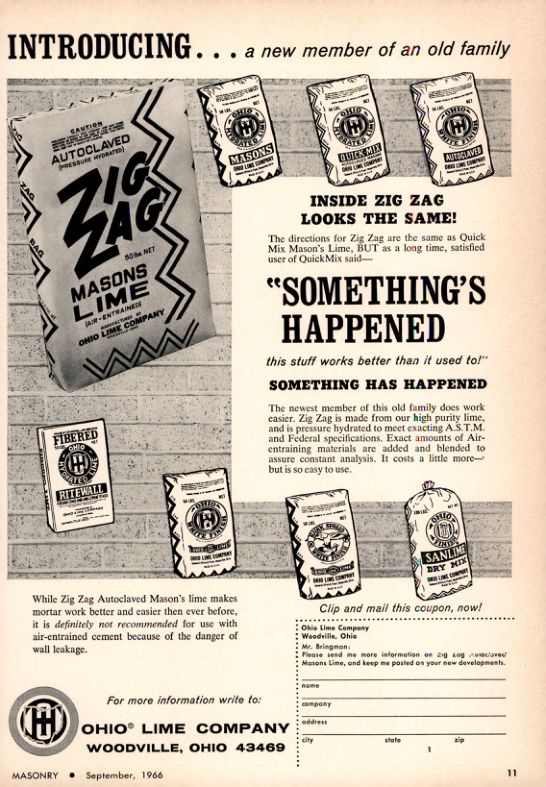 The newest member of this old family does work easier. Zig Zag is made from our high purity lime, and is pressure hydrated to meet exacting A.S.T.M. and Federal specifications. Exact amounts of Air-entraining materials are added and blended to assure constant analysis. It costs a little more but is so easy to use.