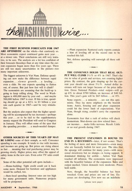 The biggest unknown is Viet Nam. Defense spending can now make the difference between rapid expansion, slower growth, a leveling, even a slide. No one expects spending to flatten out, of course. But just how fast will it climb? The economists are assuming that the build-up is going to keep rolling along. The word in Washington is 400,000 men by year end and maybe 500,000 before 1967 is over. If this is true, spending should go up at a $2 to $3 billion a year rate each quarter in 1967 and be very stimulative.