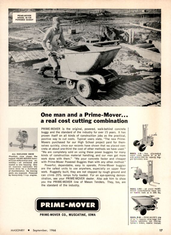 PRIME-MOVER is the original, powered, walk-behind concrete buggy and the standard of the industry for over 15 years. It has proven itself on all kinds of construction jobs as the practical, positive way to cut costs. Typical users state, "The new Prime- Movers purchased for our High School project paid for themselves quickly, since our records have shown that we placed concrete at about one-third the cost of other methods we have used." "We are completely sold on using these power buggies for many kinds of construction material handling, and our men get more work done with them." "We pour concrete faster and cheaper with Prime-Mover Powered Buggies than with any other method."