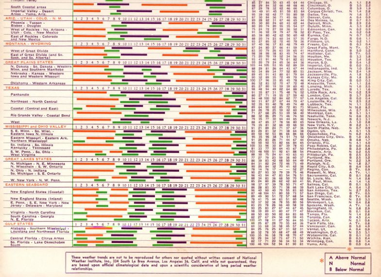 These weather trends are not to be reproduced for athers nor quated without written consent of National Weather Institute, Inc., 334 South La Brea Avenue, Los Angeles 36, Calif. and while not guaranteed, they are based upon official climatological data and upon a scientific consideration of long period weather relationships.