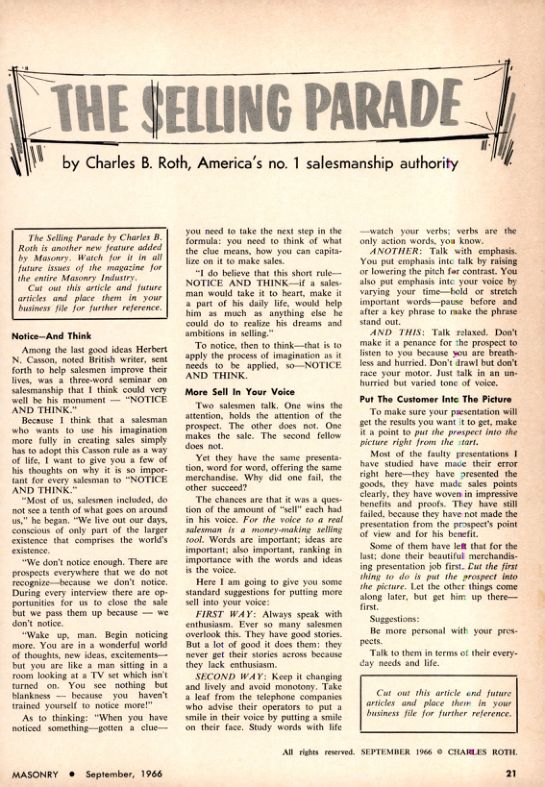 The Selling Parade by Charles B. Roth is another new feature added by Masonry. Watch for it in all future issues of the magazine for the entire Masonry Industry. Cut out this article and future articles and place them in your business file for further reference.