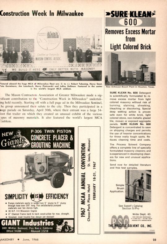 The Mason Contractors Association of Greater Milwaukee made a significant contribution to the "Construction Week in Milwaukee" undertaking held recently. Starting off with a full page ad in the Milwaukee Sentinel, the group announced their salute to the city. Then they participated in a huge parade on Saturday, April 30th, where their entrant was a large 34-foot flat trailer on which they created an unusual exhibit of the various types of masonry materials. It also featured the world's largest MCA Emblem.