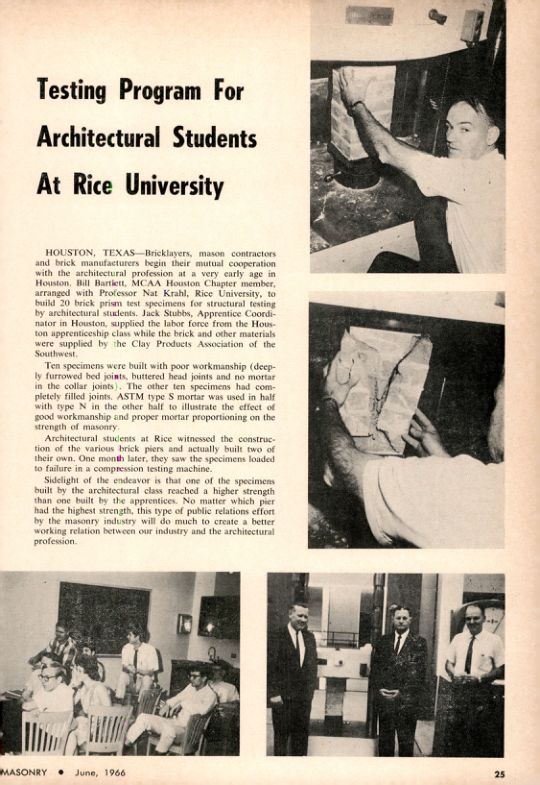 HOUSTON, TEXAS Bricklayers, mason contractors and brick manufacturers begin their mutual cooperation with the architectural profession at a very early age in Houston. Bill Bartlett, MCAA Houston Chapter member, arranged with Professor Nat Krahl, Rice University, to build 20 brick prism test specimens for structural testing by architectural students. Jack Stubbs, Apprentice Coordinator in Houston, supplied the labor force from the Houston apprenticeship class while the brick and other materials were supplied by the Clay Products Association of the Southwest.