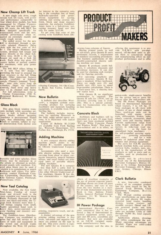 Now available, the first Goldblatt-Ames Catalog of trowel trade and drywall tools is the most complete ever issued in those fields. Profusely illustrated in full color and black-and-white, the 72-page book features more than 1,200 listings ranging from small, highly specialized hand tools to heavy duty, power-operated concrete finishing and masonry sawing equipment.