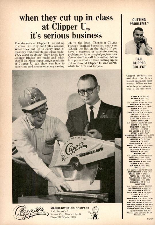 The students at Clipper U. do cut up in class. But they don't play around. What they cut up is every kind of masonry and concrete material made. They learn by doing. They know how Clipper Blades are made and what they'll do. Most important, a graduate of Clipper U. can show you how to save time and money on every sawing job in the book. There's a Clipper Factory Trained Specialist near you. (Check the list on the right.) If you have a masonry or concrete sawing problem, or for a proof-of-performance demonstration, call him collect. Make him prove that all that cutting up he did in class at Clipper U. was worth-while for him and for you.