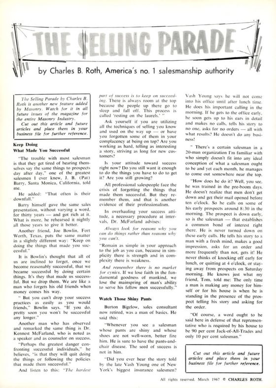 The Selling Parade by Charles B. Roth is another new feature added by Masonry. Watch for it in all future issues of the magazine for the entire Masonry Industry.
