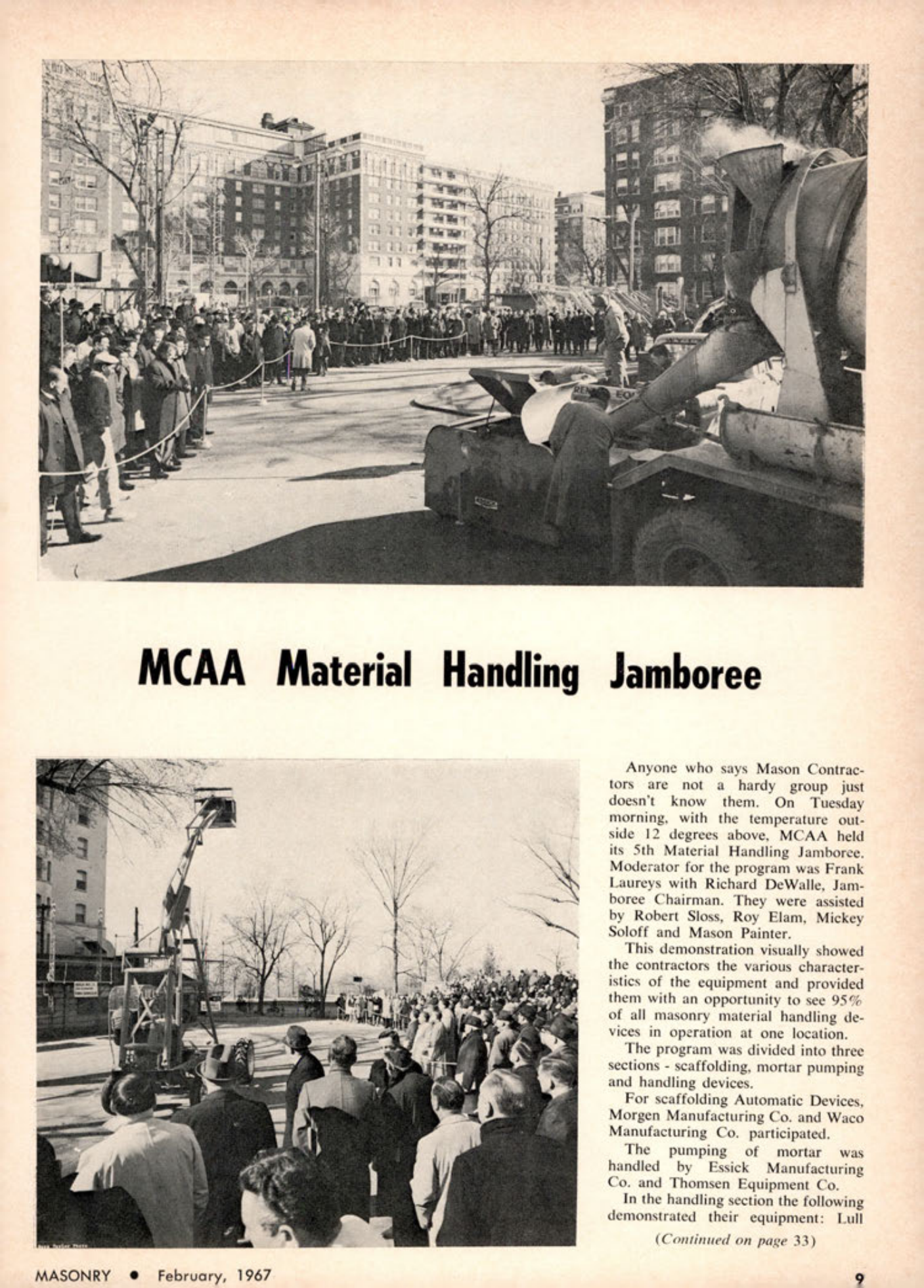 Anyone who says Mason Contractors are not a hardy group just doesn't know them. On Tuesday morning, with the temperature outside 12 degrees above, MCAA held its 5th Material Handling Jamboree. Moderator for the program was Frank Laureys with Richard DeWalle, Jamboree Chairman. They were assisted by Robert Sloss, Roy Elam, Mickey Soloff and Mason Painter.