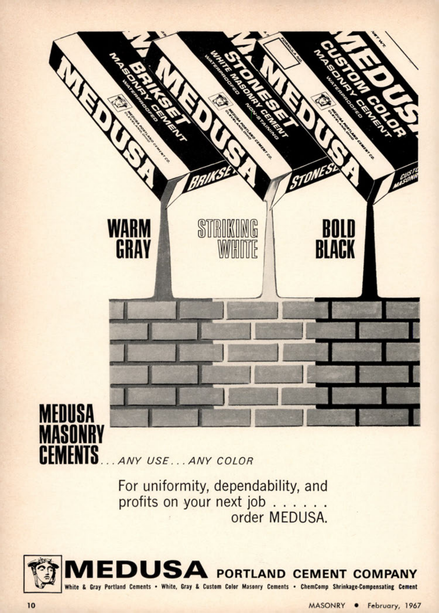 For uniformity, dependability, and profits on your next job order MEDUSA. MEDUSA PORTLAND CEMENT COMPANY White & Gray Portland Cements White, Gray & Custom Color Masonry Cements ChemComp Shrinkage-Compensating Cement