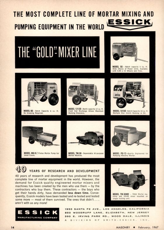 40 years of research and development has produced the most complete line of mortar equipment in the world. However, the demand for Essick quality engineered mortar mixers and machines has been created by the men who use them by the contractors who buy them. These contractors the boys who get their hands dirty, have demanded less down time. Consequently, Essick models have been tested and re-tested and tested some moremost of them survived. The ones that didn't... aren't with us any more!