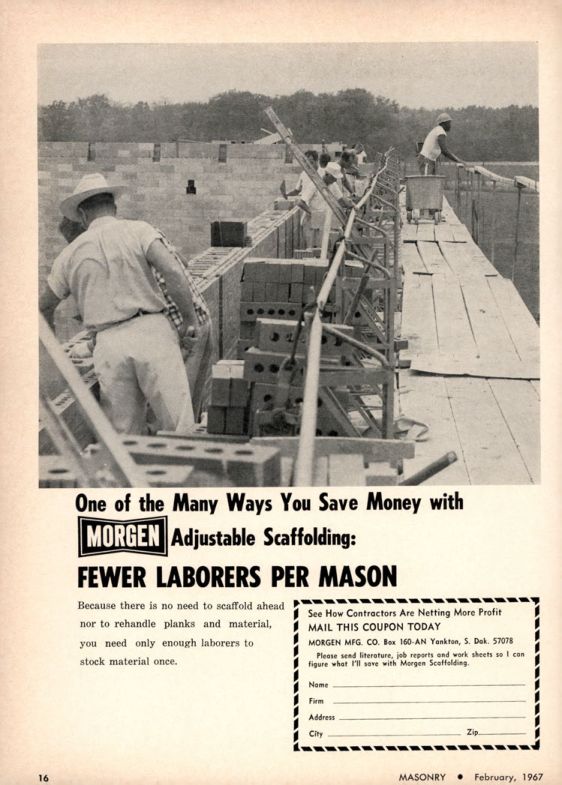 One of the Many Ways You Save Money with MORGEN Adjustable Scaffolding: FEWER LABORERS PER MASON