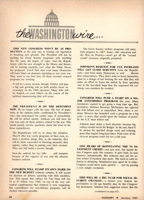 THIS NEW CONGRESS WON'T BE AS PRODUCTIVE as the past one in turning out legislation or breaking new ground. The President will not be pushing his Great Society programs with anything like the same old degree of vigor. And the Republicans, with the new strength in the House and Senate, will be looking carefully over what the White House has proposed. You'll find that even many Democrats will back limits on domestic spending as war costs rise. They want to see first how all those recently enacted programs are working.