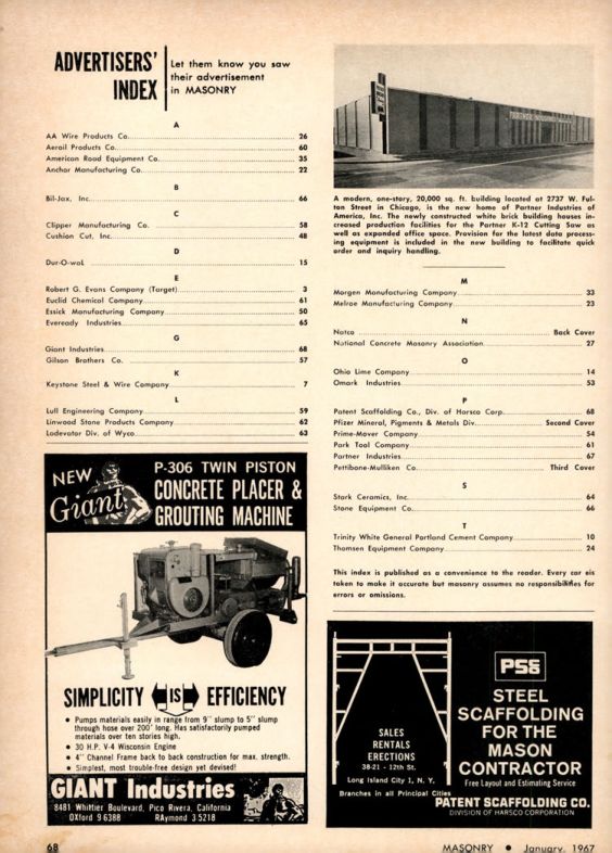 This index is published as a convenience to the reader. Every car eis taken to make it accurate but masonry assumes no responsibilities for errors or omissions.