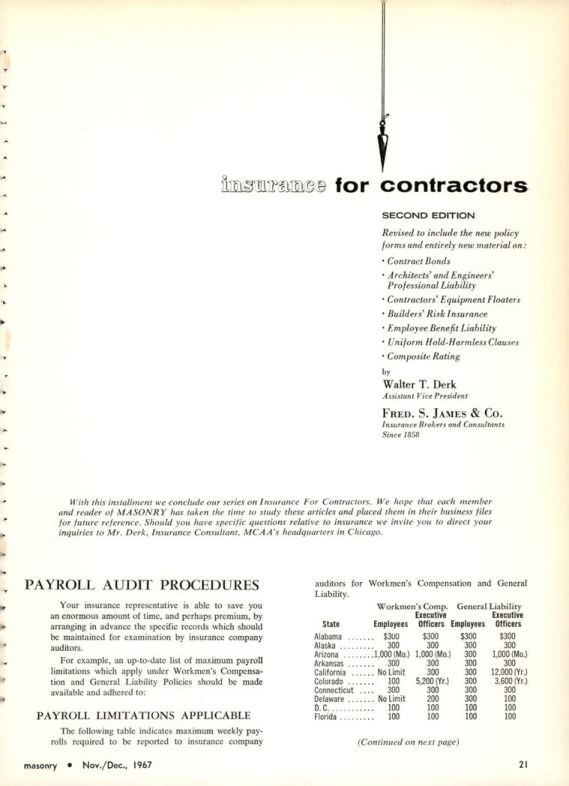 With this installment we conclude our series on Insurance For Contractors. We hope that each member and reader of MASONRY has taken the time to study these articles and placed them in their business files for future reference. Should you have specific questions relative to insurance we invite you to direct your inquiries to Mr. Derk, Insurance Consultant, MCAA's headquarters in Chicago.