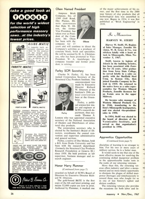 Farley, a native of Des Moines, hold a B.S. from Drake University and has been with the research department (formerly the Structural Clay Products Research Foundation at Geneva Ill.) since 1958. He held positions as lab supervisor, business manager and research engineer.