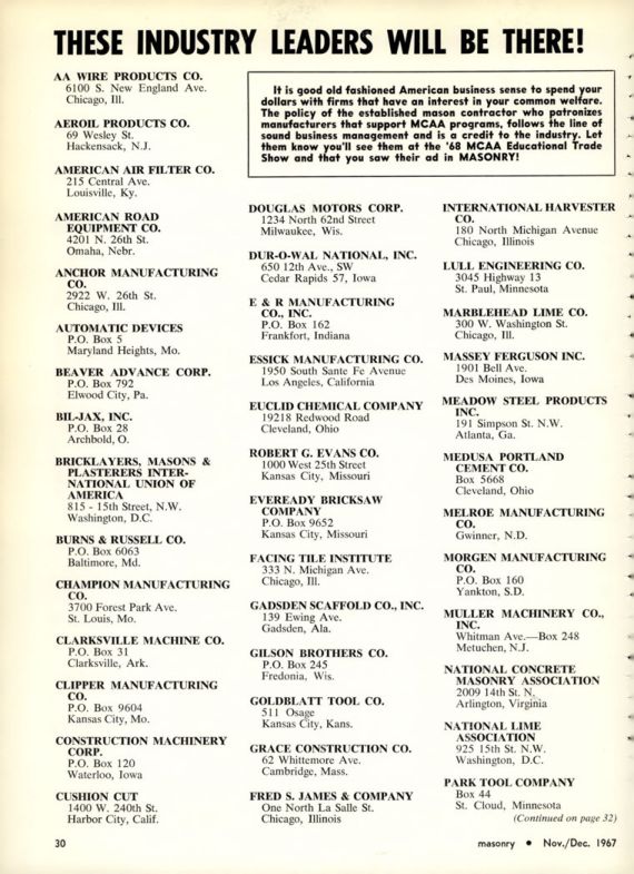 It is good old fashioned American business sense to spend your dollars with firms that have an interest in your common welfare. The policy of the established mason contractor who patronizes manufacturers that support MCAA programs, follows the line of sound business management and is a credit to the industry. Let them know you'll see them at the '68 MCAA Educational Trade Show and that you saw their ad in MASONRY!