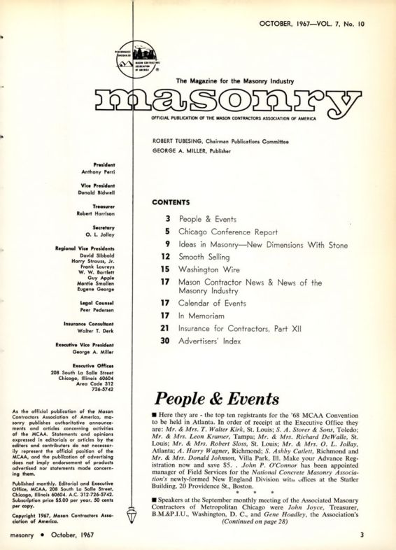 As the official publication of the Mason Contractors Association of America, masonry publishes authoritative announcements and articles concerning activities of the MCAA. Statements and opinions expressed in editorials or articles by the editors and contributors do not necessarily represent the official position of the MCAA, and the publication of advertising does not imply endorsement of products advertised nor statements made concerning them.