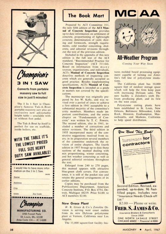 Included in the appendix of this new edition is the full text of the ACI standard, "Recommended Practice for Concrete Inspection" (ACI 311-64). Based on information from many sources, organizations, and individuals, ACT's Manual of Concrete Inspection describes methods of inspecting concrete which are generally accepted as good practice. Besides supplementing specifications, ACT's Manual of Concrete Inspection is intended as a guide in matters not covered by the specifications.