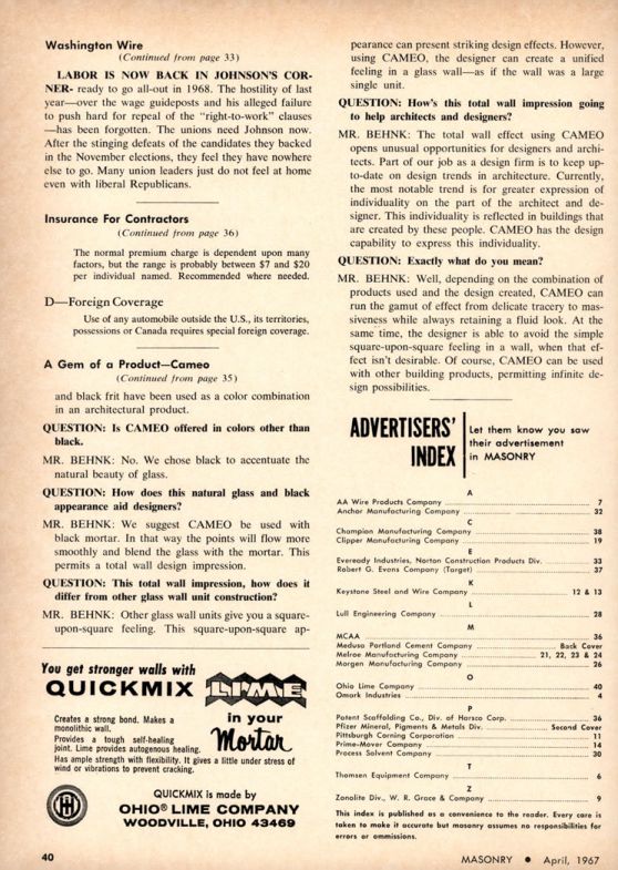 This index is published as a convenience to the reader. Every care is taken to make it accurate but masonry assumes no responsibilities for errors or ommissions.