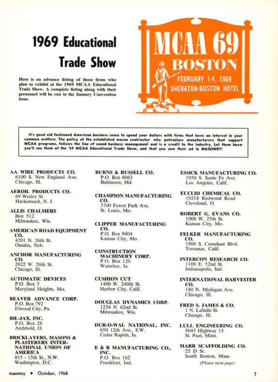 It's good old fashioned American business sense to spend your dollars with firms that have an interest in your common welfare. The policy of the established mason contractor who patronizes manufacturers that support MCAA programs, follows the line of sound business management and is a credit to the industry. Let them know you'll see them at the '69 MCAA Educational Trade Show, and that you saw their ad in MASONRY!