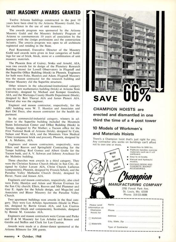 The Phoenix firm of Guirey, Srnka and Arnold, AIA, won two awards for its design of the Planetary Research Building (stone) for Lowell Observatory in Flagstaff and the Superlite Office Building (block) in Phoenix. Engineers for both were Foltz, Hamlyn and Adam. Flagstaff Masonry was the mason contractor for the research building and Warner Masonry did the Superlite structure.