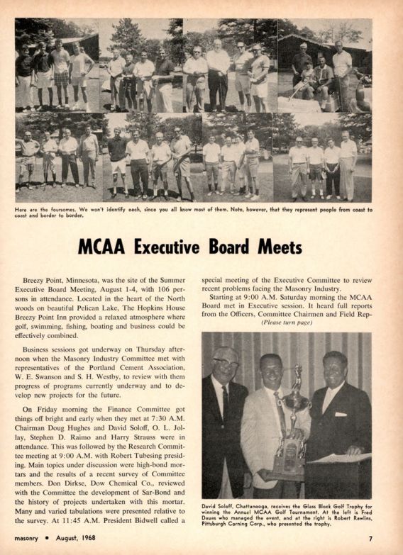 On Friday morning the Finance Committee got things off bright and early when they met at 7:30 A.M. Chairman Doug Hughes and David Soloff, O. L. Jollay, Stephen D. Raimo and Harry Strauss were in attendance. This was followed by the Research Committee meeting at 9:00 A.M. with Robert Tubesing presiding. Main topics under discussion were high-bond mortars and the results of a recent survey of Committee members. Don Dirkse, Dow Chemical Co., reviewed with the Committee the development of Sar-Bond and the history of projects undertaken with this mortar. Many and varied tabulations were presented relative to the survey. At 11:45 A.M. President Bidwell called a special meeting of the Executive Committee to review recent problems facing the Masonry Industry.