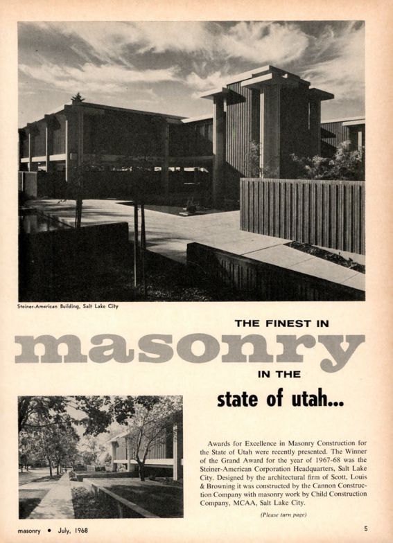 Awards for Excellence in Masonry Construction for the State of Utah were recently presented. The Winner of the Grand Award for the year of 1967-68 was the Steiner-American Corporation Headquarters, Salt Lake City. Designed by the architectural firm of Scott, Louis & Browning it was constructed by the Cannon Construction Company with masonry work by Child Construction Company, MCAA, Salt Lake City.