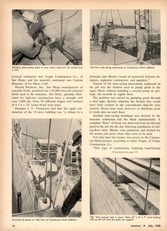 Hazard Products, Inc., San Diego manufacturer of concrete block, produced the 105,000 two-cell concrete block used in the structure. The block, specially fabricated for high-rise construction have a strength well over 3,000 psi. Over 50 different shapes and textures of 8 x 8 x 16" series block were used.