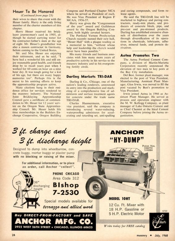 Many citations hang in their residence office for services rendered to the masonry industry. The National Joint Bricklaying Apprenticeship Council gave a certificate of commendation to Mr. Heuer for 12 years' service on the Oregon State Apprenticeship Council. Mr. Heuer holds life time memberships in the Builders Exchange Cooperative, Oregon Building Congress and Portland Chapter MCA where he served as President of each. He was Vice President of Region F MCAA, 1956-57.