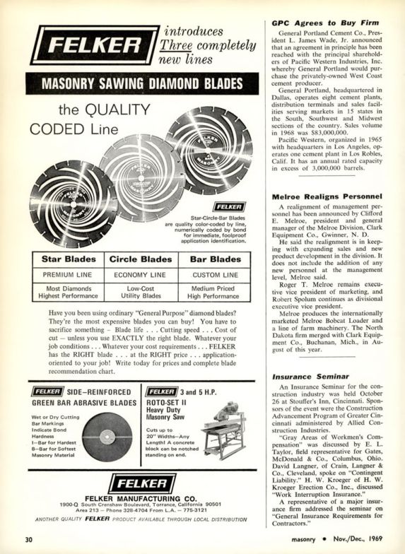 Have you been using ordinary "General Purpose" diamond blades? They're the most expensive blades you can buy! You have to sacrifice something: Blade life, cutting speed, cost of cut, unless you use EXACTLY the right blade. Whatever your job conditions, whatever your cost requirements, FELKER has the RIGHT blade at the RIGHT price, application-oriented to your job! Write today for prices and complete blade recommendation chart.