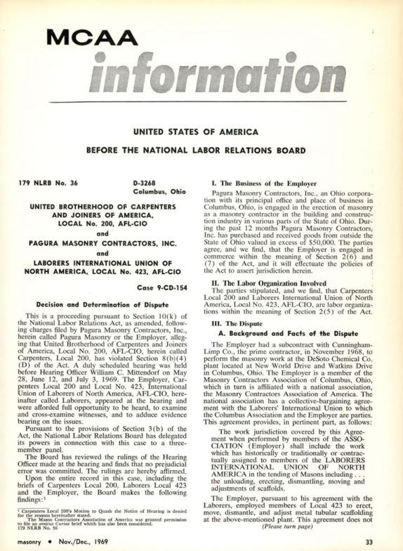 The Employer had a subcontract with Cunningham-Limp Co., the prime contractor, in November 1968, to perform the masonry work at the DeSoto Chemical Co. plant located at New World Drive and Watkins Drive in Columbus, Ohio. The Employer is a member of the Masonry Contractors Association of Columbus, Ohio, which in turn is affiliated with a national association, the Masonry Contractors Association of America. The national association has a collective-bargaining agreement with the Laborers' International Union to which the Columbus Association and the Employer are parties. This agreement provides, in pertinent part, as follows: