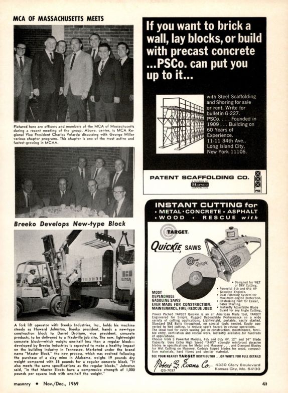 If you want to brick a wall, lay blocks, or build with precast concrete ...PSCo. can put you up to it... Pictured here are officers and members of the MCA of Massachusetts during a recent meeting of the group. Above, center, is MCA Regional Vice President Charles Velardo discussing with George Miller various chapter programs. This chapter is one of the most active and fastest-growing in MCAA.