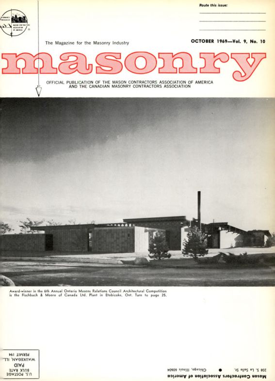 Award-winner in the 6th Annual Ontario Masons Relations Council Architectural Competition is the Fischbach & Moore of Canada Ltd. Plant in Etobicoke, Ont. Turn to page 25.