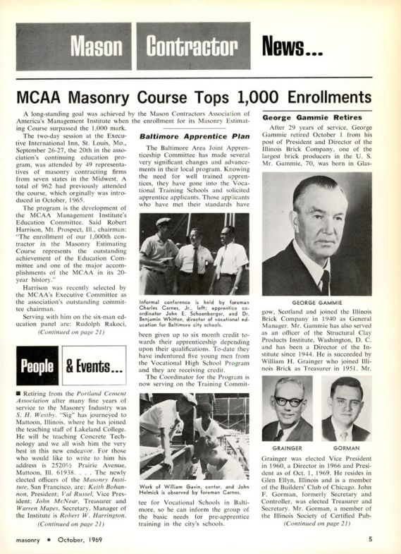 After 29 years of service, George Gammie retired October 1 from his post of President and Director of the Illinois Brick Company, one of the largest brick producers in the U. S. Mr. Gammie, 70, was born in Glasgow, Scotland and joined the Illinois Brick Company in 1940 as General Manager. Mr. Gammie has also served as an officer of the Structural Clay Products Institute, Washington, D. C. and has been a Director of the Institute since 1944. He is succeeded by William H. Grainger who joined Illinois Brick as Treasurer in 1951. Mr. Grainger was elected Vice President in 1960, a Director in 1966 and President as of Oct. 1, 1969. He resides in Glen Ellyn, Illinois and is a member of the Builders' Club of Chicago. John F. Gorman, formerly Secretary and Controller, was elected Treasurer and Secretary. Mr. Gorman, a member of the Illinois Society of Certified Pub- (Continued on page 21)