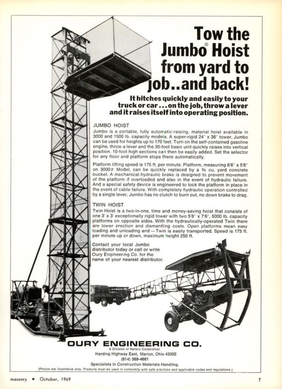 Jumbo is a portable, fully automatic-raising, material hoist available in 3000 and 1500 lb. capacity models. A super-rigid 24" x 36" tower, Jumbo can be used for heights up to 170 feet. Turn on the self-contained gasoline engine, throw a lever and the 30-foot basic unit quickly raises into vertical position. 10-foot high sections can then be easily added. Set the selector for any floor and platform stops there automatically.