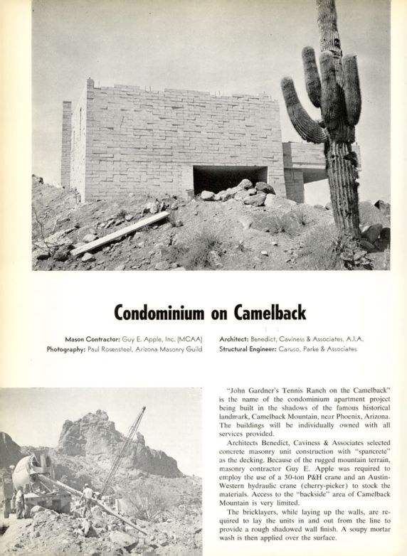 "John Gardner's Tennis Ranch on the Camelback" is the name of the condominium apartment project being built in the shadows of the famous historical landmark, Camelback Mountain, near Phoenix, Arizona. The buildings will be individually owned with all services provided.