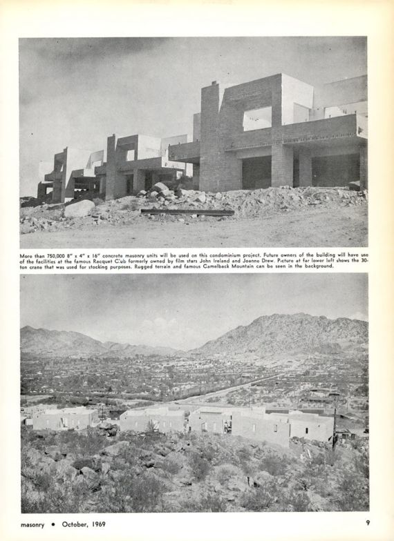 More than 750,000 8" x 4" x 16" concrete masonry units will be used on this condominium project. Future owners of the building will have use of the facilities at the famous Racquet Club formerly owned by film stars John Ireland and Joanne Drew. Picture at far lower left shows the 30-ton crane that was used for stocking purposes. Rugged terrain and famous Camelback Mountain can be seen in the background.