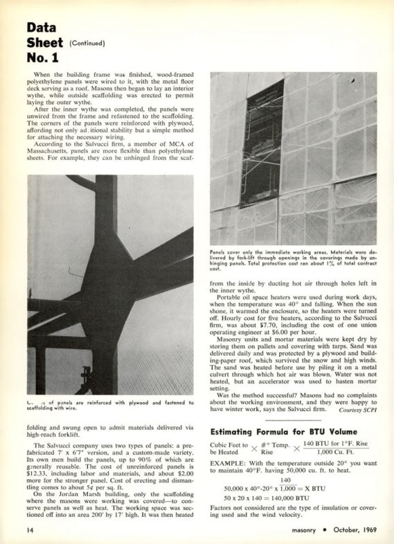 Portable oil space heaters were used during work days, when the temperature was 40° and falling. When the sun shone, it warmed the enclosure, so the heaters were turned off. Hourly cost for five heaters, according to the Salvucci firm, was about $7.70, including the cost of one union operating engineer at $6.00 per hour.