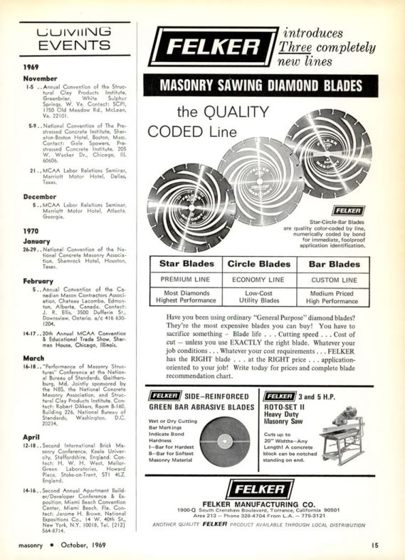 Have you been using ordinary "General Purpose" diamond blades? They're the most expensive blades you can buy! You have to sacrifice something Blade life Cutting speed... Cost of cut unless you use EXACTLY the right blade. Whatever your job conditions... Whatever your cost requirements... FELKER has the RIGHT blade .. at the RIGHT price... application-oriented to your job! Write today for prices and complete blade recommendation chart.