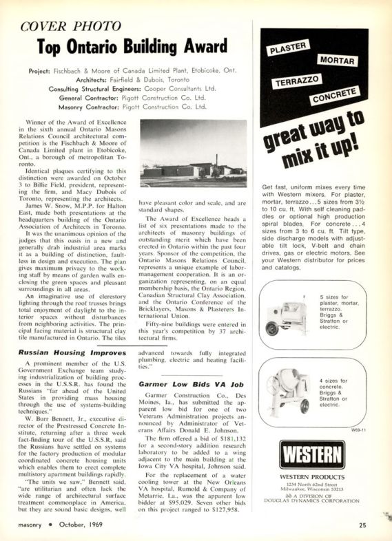 Winner of the Award of Excellence in the sixth annual Ontario Masons Relations Council architectural competition is the Fischbach & Moore of Canada Limited plant in Etobicoke, Ont., a borough of metropolitan Toronto.