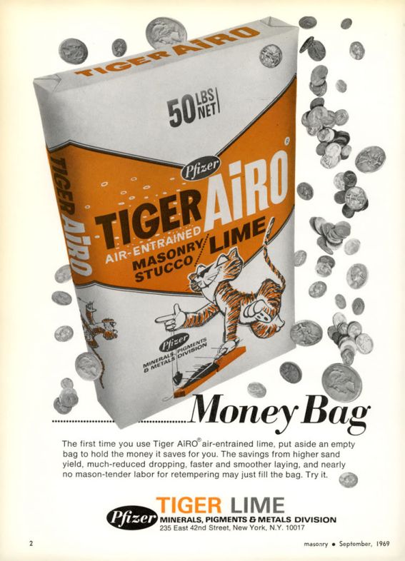 The first time you use Tiger AiRO air-entrained lime, put aside an empty bag to hold the money it saves for you. The savings from higher sand yield, much-reduced dropping, faster and smoother laying, and nearly no mason-tender labor for retempering may just fill the bag. Try it.