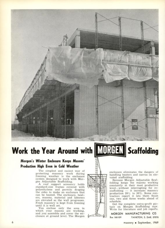 Get the complete extra-profit picture on Morgen Scaffolding now. Write for literature and job reports. MORGEN MANUFACTURING CO. Box 160-69 YANKTON, S. DAK. 57078 masonry September, 1969