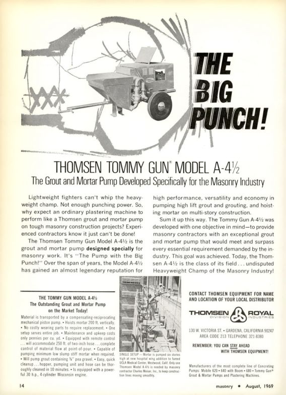 Sum it up this way. The Tommy Gun A-4½ was developed with one objective in mind-to provide masonry contractors with an exceptional grout and mortar pump that would meet and surpass every essential requirement demanded by the industry. This goal was achieved. Today, the Thomsen A-4½ is the class of its field... undisputed Heavyweight Champ of the Masonry Industry!