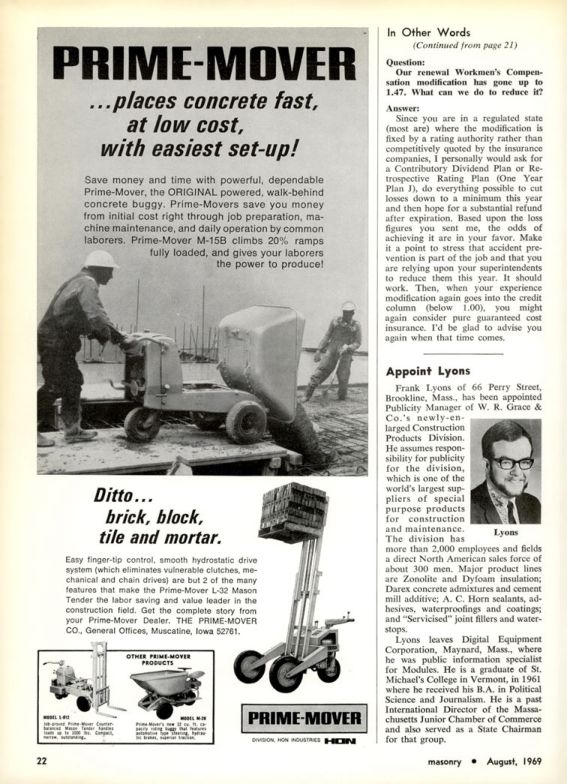 Frank Lyons of 66 Perry Street, Brookline, Mass., has been appointed Publicity Manager of W. R. Grace & Co.'s newly-enlarged Construction Products Division. He assumes responsibility for publicity for the division, which is one of the world's largest suppliers of special purpose products for construction and maintenance. The division has more than 2,000 employees and fields a direct North American sales force of about 300 men. Major product lines are Zonolite and Dyfoam insulation; Darex concrete admixtures and cement mill additive; A. C. Horn sealants, adhesives, waterproofings and coatings; and "Servicised" joint fillers and water-stops.