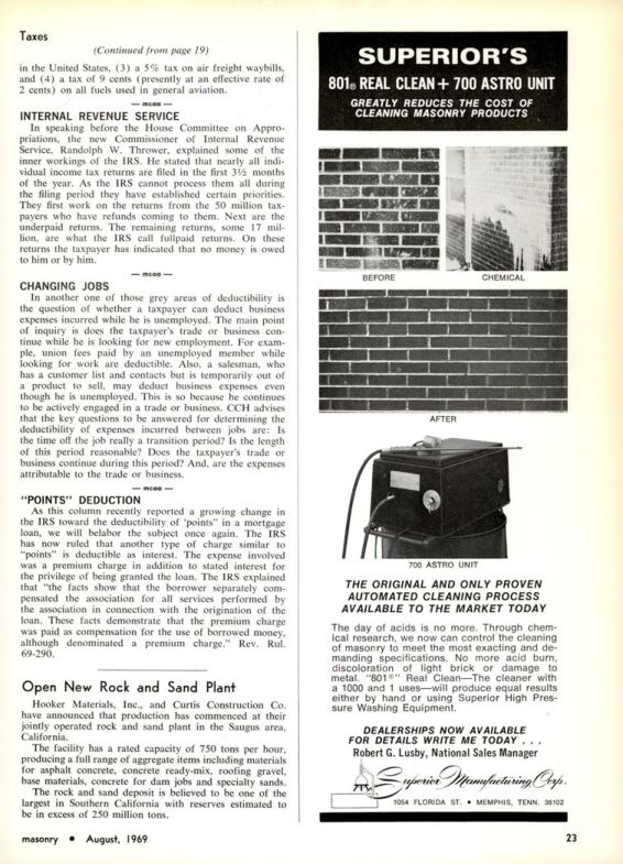 The day of acids is no more. Through chemical research, we now can control the cleaning of masonry to meet the most exacting and demanding specifications. No more acid burn, discoloration of light brick or damage to metal. "801" Real Clean-The cleaner with a 1000 and 1 uses-will produce equal results either by hand or using Superior High Pressure Washing Equipment.
