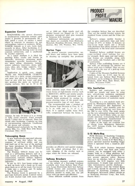 Cost-cutting masonry scaffold systems are the subject of a four-page brochure available now from Safway Steel Products. Large illustrations show how Safway scaffold frames and accessories enable masonry contractors to erect the work platform needed to make any size job move with top speed and efficiency.