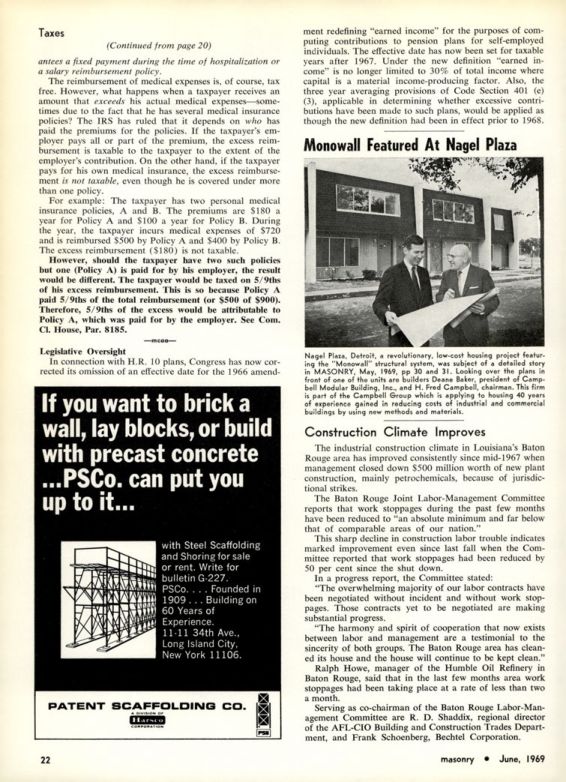 Nagel Plaza, Detroit, a revolutionary, low-cost housing project featuring the "Monowall" structural system, was subject of a detailed story in MASONRY, May, 1969, pp 30 and 31. Looking over the plans in front of one of the units are builders Deane Baker, president of Campbell Modular Building, Inc., and H. Fred Campbell, chairman. This firm is part of the Campbell Group which is applying to housing 40 years of experience gained in reducing costs of industrial and commercial buildings by using new methods and materials.