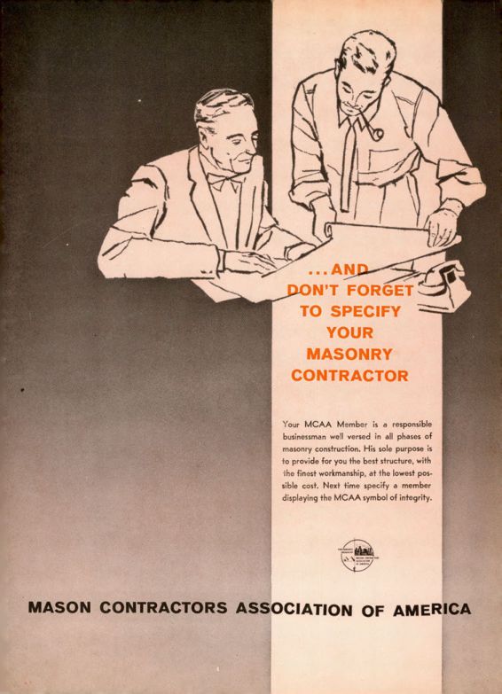Your MCAA Member is a responsible businessman well versed in all phases of masonry construction. His sole purpose is to provide for you the best structure, with the finest workmanship, at the lowest possible cost. Next time specify a member displaying the MCAA symbol of integrity.